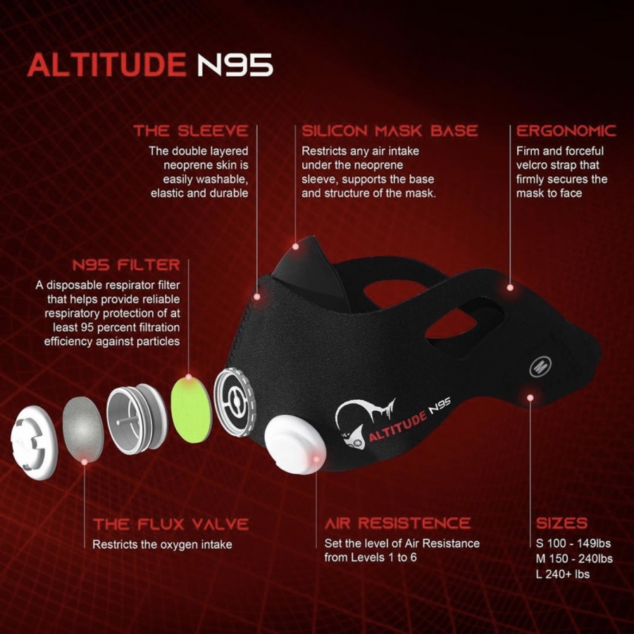 ALTITUDE MASK es el dispositivo de resistencia respiratoria líder en el mundo, diseñado para aumentar la potencia respiratoria, la resistencia y mejorar la mecánica de la respiración. Lanza su versión ALTITUDE N95 con un respirador desechable que ayuda a proporcionar una protección respiratoria confiable de al menos un 95% de eficiencia de filtración contra partículas. Con la opción de eliminar el "MODO DE RESTRICCIÓN DE AIRE" cuando no se entrena.